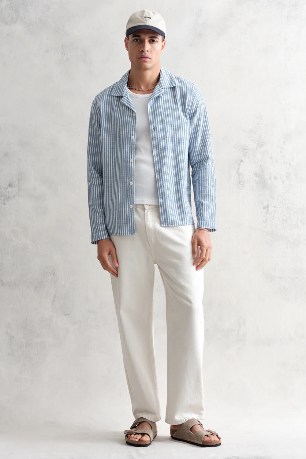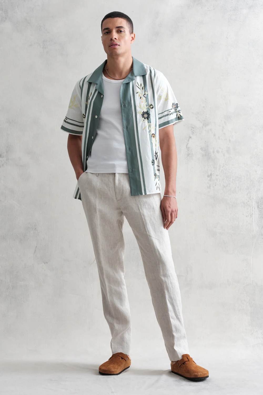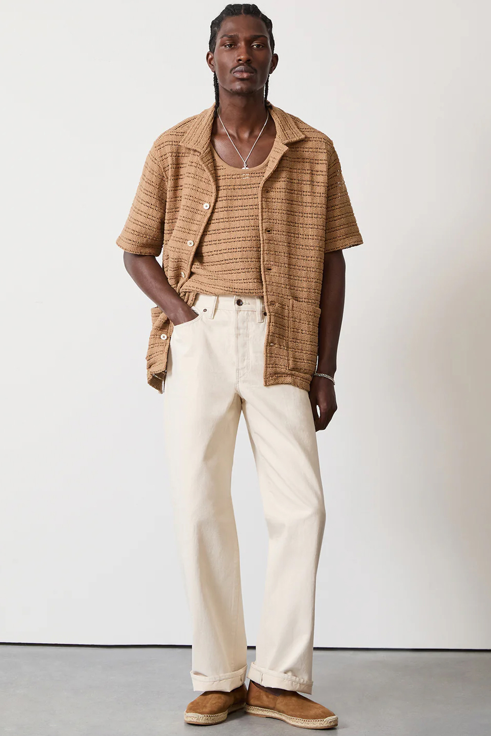 Begin with a plain T-shirt or vest (white is all the time a secure wager) and, relying on the temperature, add a camp collar shirt, a long-sleeve linen shirt or an overshirt excessive. Go away it unbuttoned for greatest outcomes.